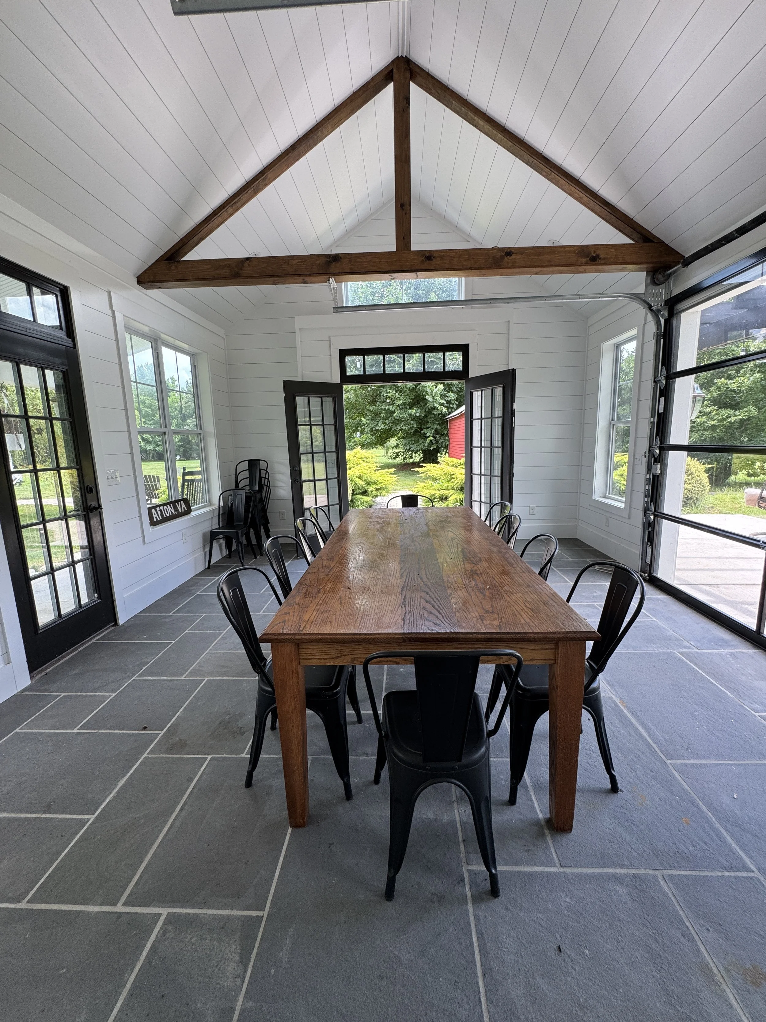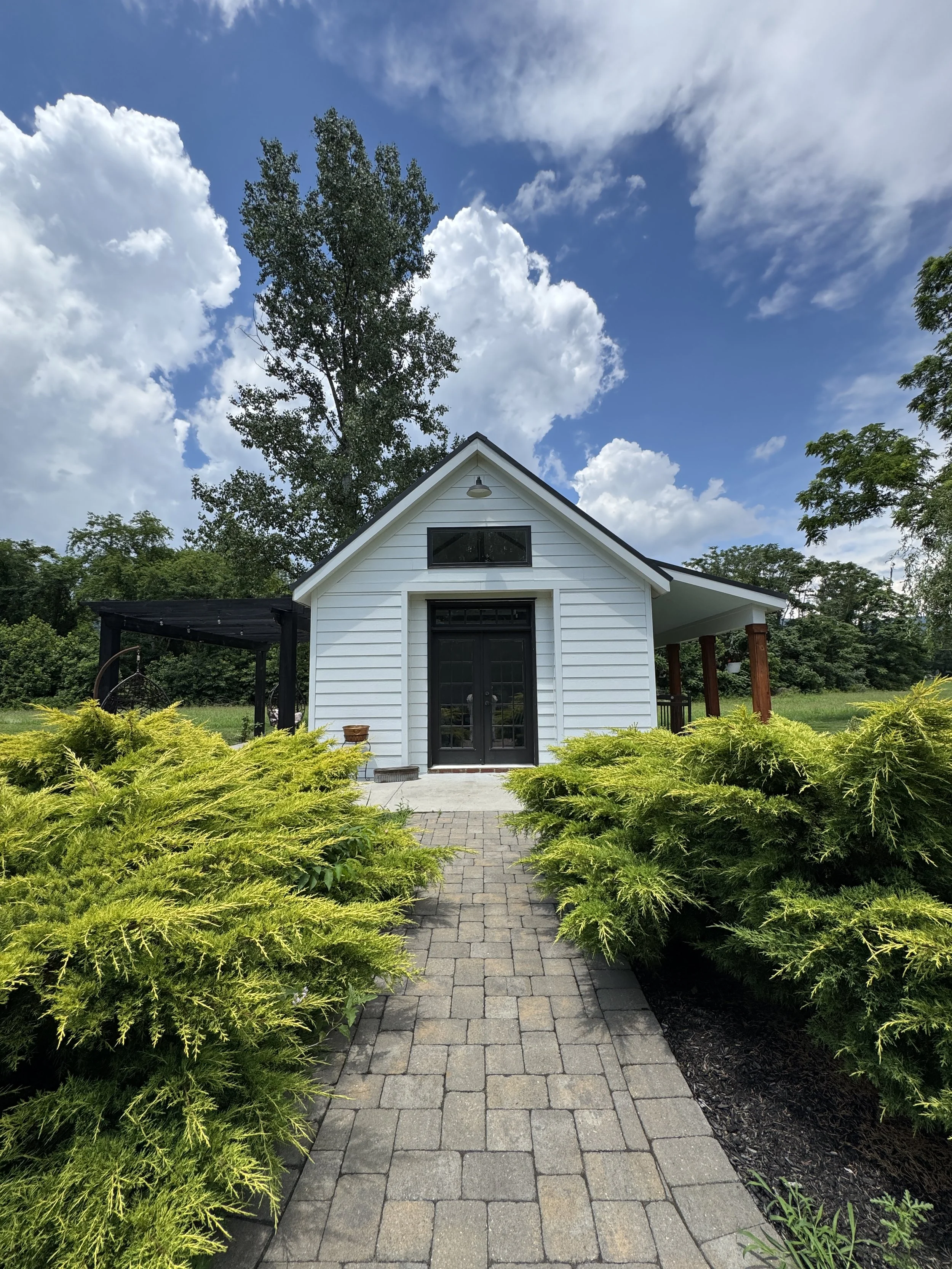 Outside, the property opens to postcard views of the Blue Ridge Mountains and views of Veritas vines. A beautifully reimagined shed—outfitted with French doors and sophisticated roll-up carriage openings—serves as a charming setting for private chef dinners, yoga sessions, or intimate celebrations. It’s equal parts rustic and refined, perfect for moments you’ll want to remember.